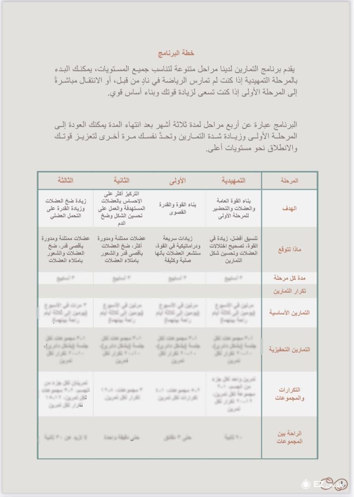 - شرح تفصيلي لكل تمرين مع عدد التكرارات والجولات.